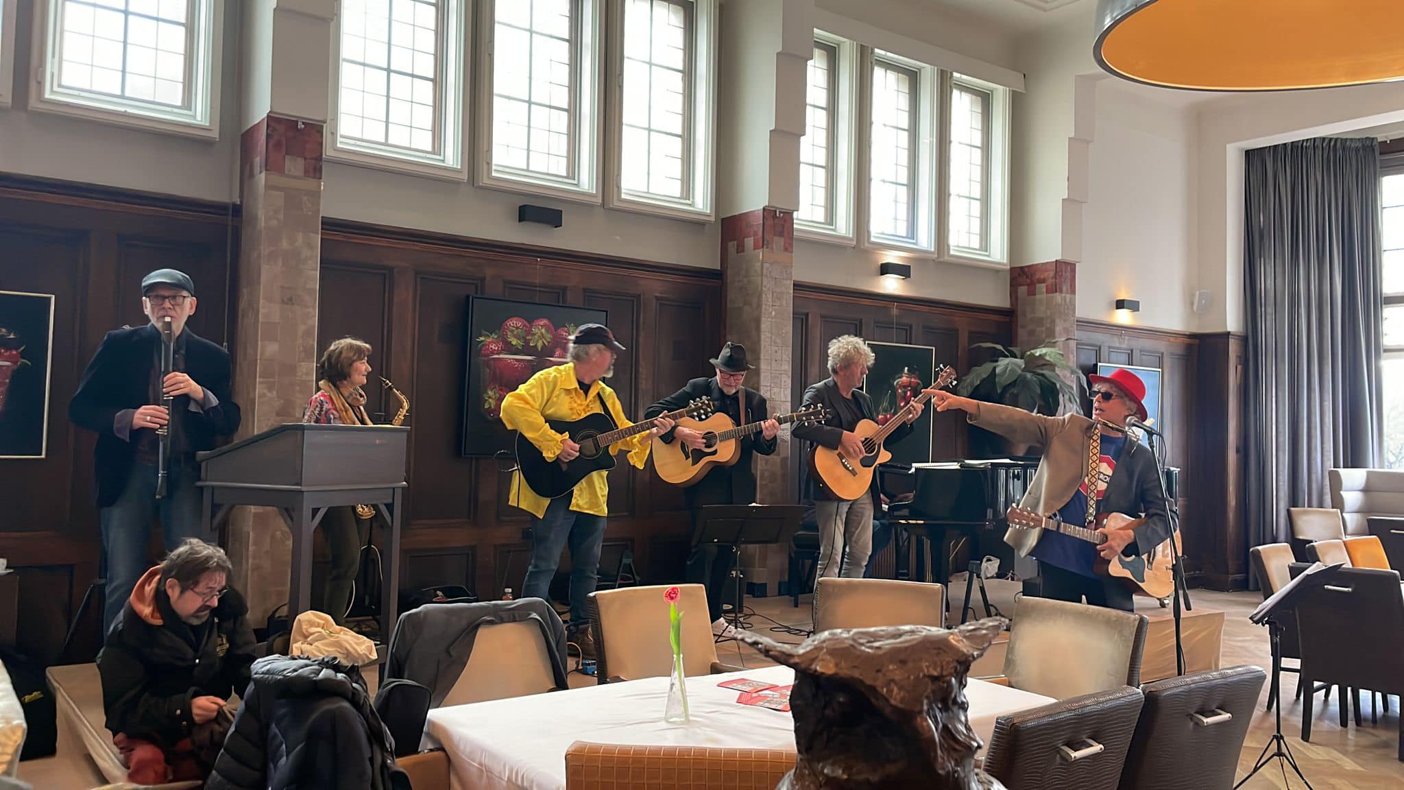 opening kunstlijn 2023, Haarlem – 5 november 2023 Locatie: Sociëteit Vereeniging, Zijlweg 1, – Haarlem – ← De Filistijnen >> Op uitnodiging van Rien van Nunen Genootschap, Hillegom - 16 oktober 2023 De Filistijnen >> Gluren bij de Buren Haarlem - 4 februari 2024 → Foto: Debbie Saul Tekening: PM Deléfre